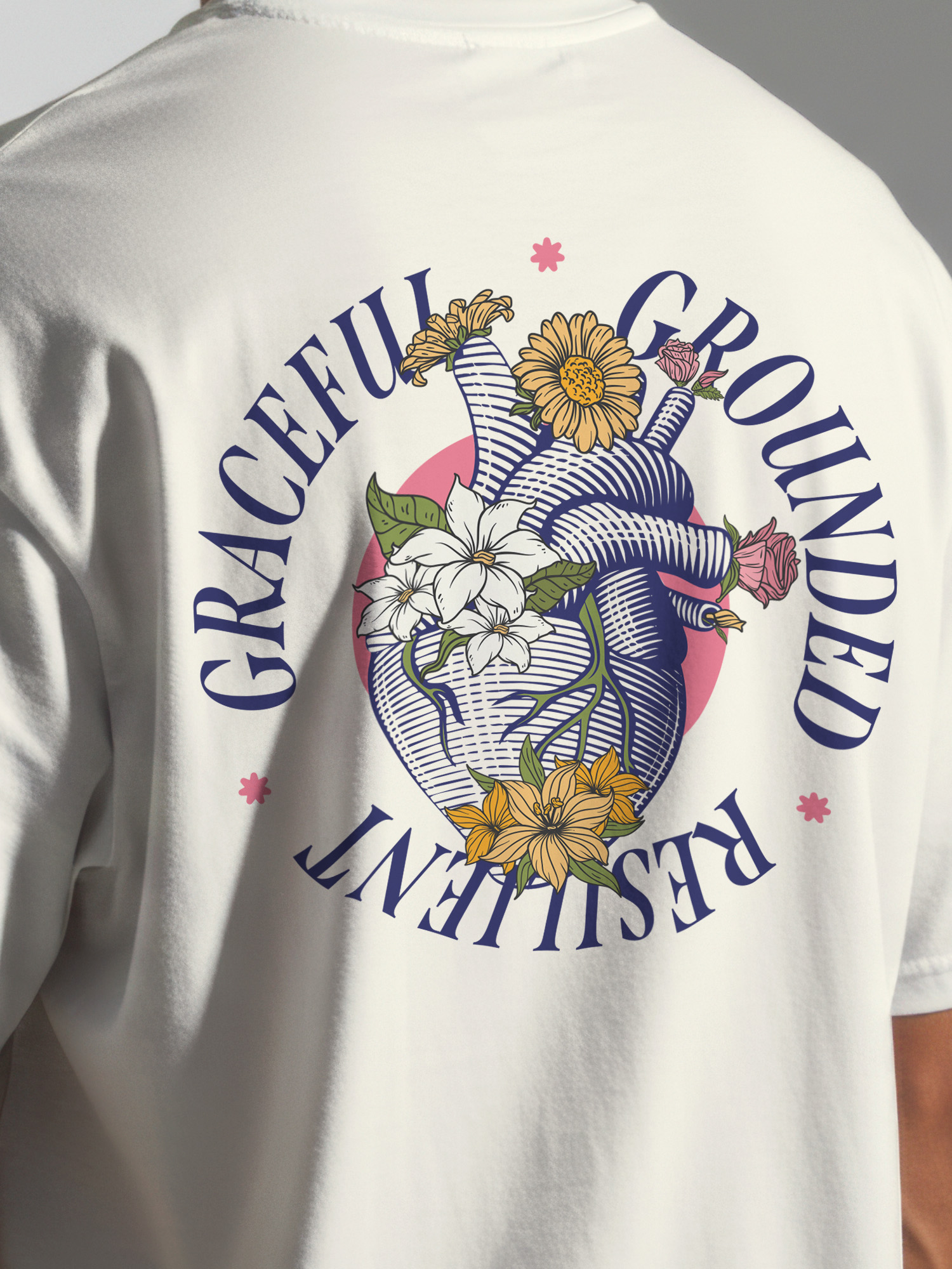 Back: A detailed anatomical heart blossoms with vibrant flowers, framed by the empowering words GRACEFUL · GROUNDED · RESILIENT – a reminder that beauty and strength can coexist.