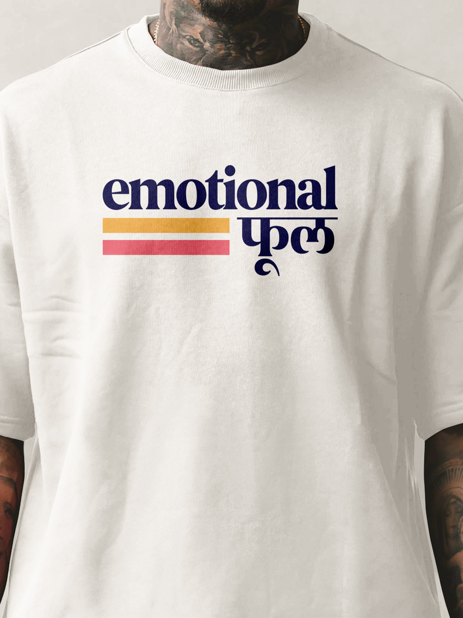Front: Minimal yet impactful typography blends emotional in bold lettering with फूल (“phool” – flower) in Devanagari script, accented by retro-inspired stripes for a timeless, statement look.